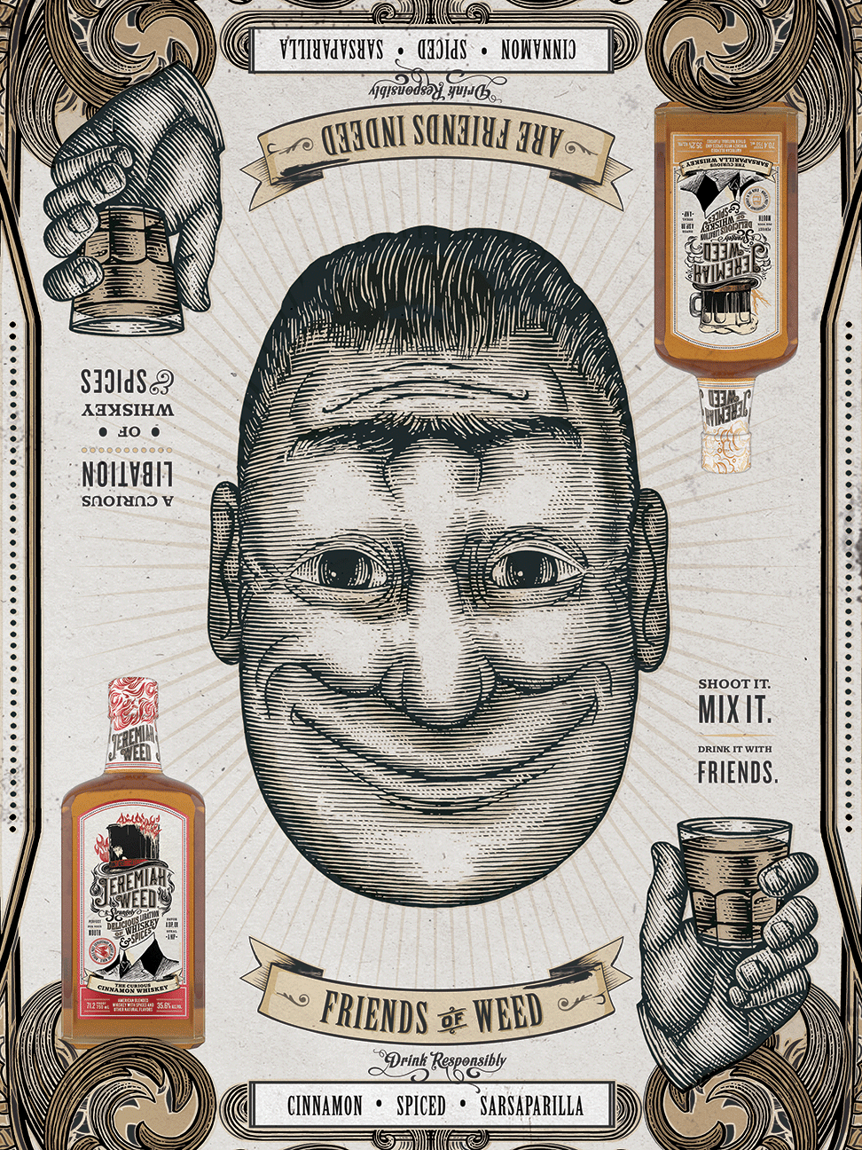 To revitalize the Jeremiah Weed brand, Diageo’s innovation group created a whole new family of flavors. They also redesigned the bottle with a freak show vibe. And with Weed in the name, it lent itself to this irreverent look and voice.